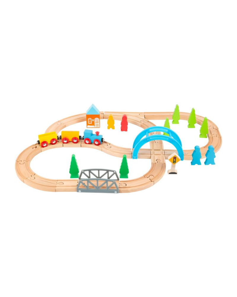 Set ferrovia in legno, metallo e plastica composta da 40 pezzi. Dimensioni con binari ferroviari assemblati 45 x 60 x 9,5 cm, locomotiva con rimorchi: 21 x 3,5 x 4 cm. Da 3+ anni.