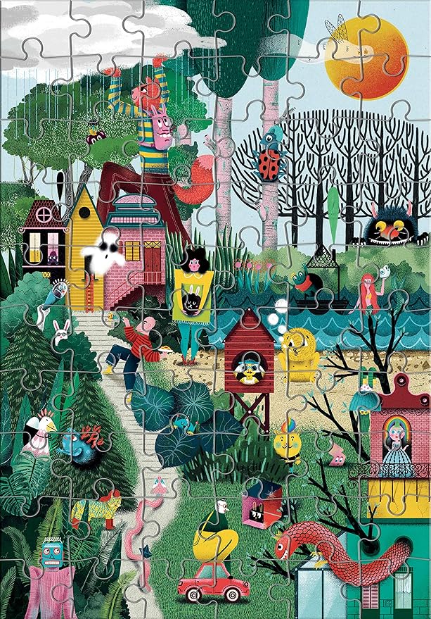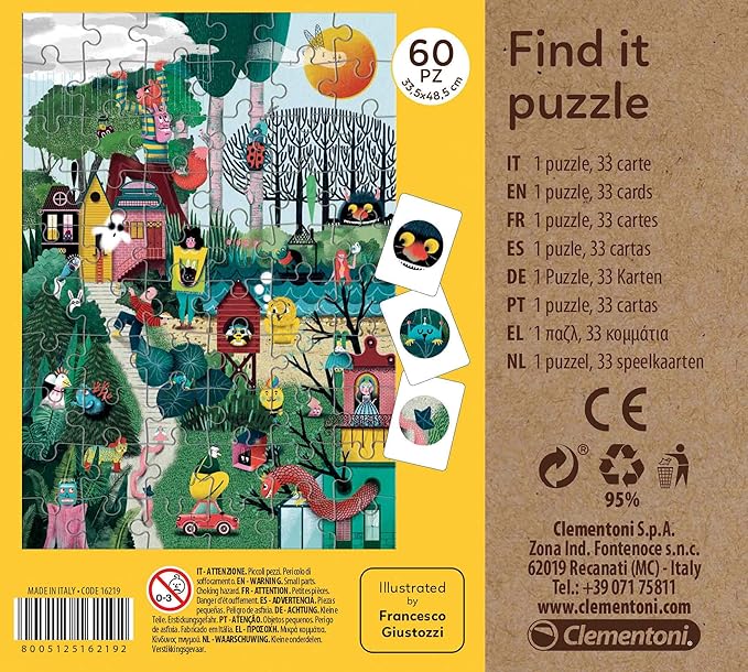 - Un puzzle d'autore con 60 grandi tessere e un mazzo da 33 carte con illustrati gli elementi da cercare all'interno dell'immagine del puzzle una volto composto