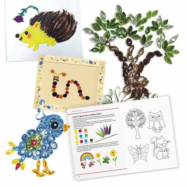 Personalizza le superfici in vetro con i window colors e abbina ai tuoi disegni tanti quadretti da realizzare con la carta e la tecnica del quilling. CONTENUTO: 6 window colors; 1 penna quilling; 1 pennello; Colla; Cartone; Forbici; Pattern da ritagliare; Istruzioni.