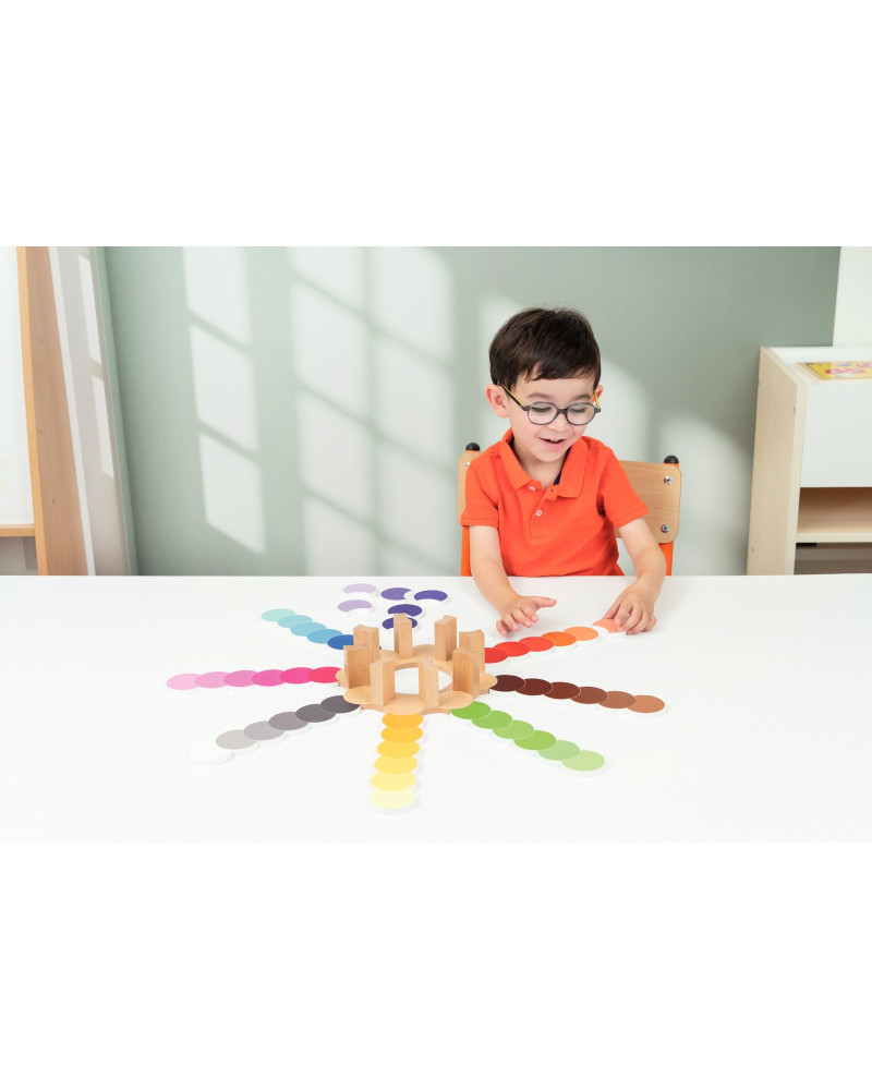 I bambini allineano i petali colorati dal più chiaro al più scuro intorno al centro del fiore per ricreare le sfumature di ogni colore. Questo li aiuta a riconoscere le sfumature dei colori e ad ampliare il loro vocabolario. Possono anche utilizzare i petali per creazioni libere. Diametro fiore 21 x 6 cm.