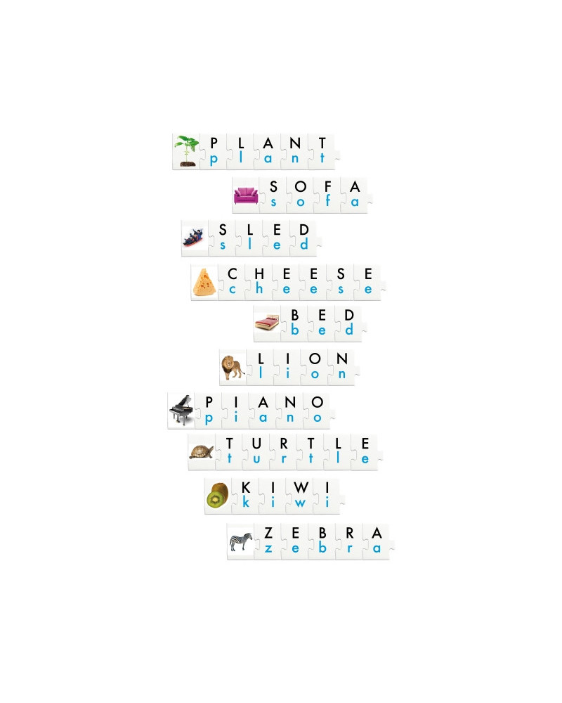 Set composto da 32 immagini e 88 lettere per formare la parola corrispondente ad ogni immagine in diverse lingue. Contenuto: 32 carte plastificate illustrate di 5,8 x 4,9 cm e 88 carte plastificate con lettere 5,8 x 4,3 cm e 1 CD MP3. Da 4+ anni.