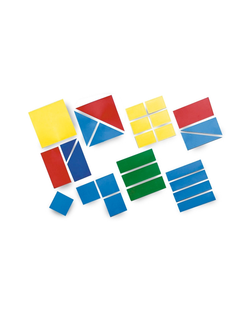 La confezione è formata da un quadrato e da 26 pezzi in vari colori che corrispondono a differenti frazioni. In un pratico contenitore con coperchio. In plastica; lato 10 cm