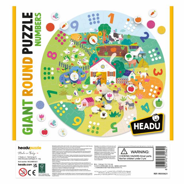 Costruisci il grande puzzle della fattoria e scopri i numeri e le quantità. In più, conta gli elementi nascosti con i gettoni! CONTENUTO: 1 puzzle da 37 pezzi; 45 gettoni.