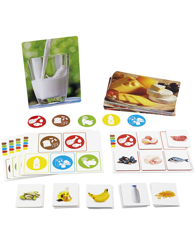 Vengono proposti 3 tipi di attività sul cibo per incoraggiare la conoscenza, il linguaggio, la discussione e il piacere sensoriale. 1 gioco linguistico: i bambini imparano a riconoscere i diversi cibi e le loro origini, e a descrivere un piatto, guardando i pannelli fotografici. 1 gioco di ordinamento: i 5 gettoni rotondi rappresentano 5 gruppi di alimenti e consentono di ordinare le foto per sapore, colore, tipo di pasto, ecc. 2 giochi del lotto: Lotto “1 gruppo alimentare” o lotto “5 gruppi alimentari”. Contenuto: 35 tabelloni fotografici e 5 tabelloni del lotto fronte-retro 24 x 18cm. 5 gettoni illustrati Ø 6cm. 25 fotografie 8 x 7cm. 1 libretto didattico. Da 4+ anni.
