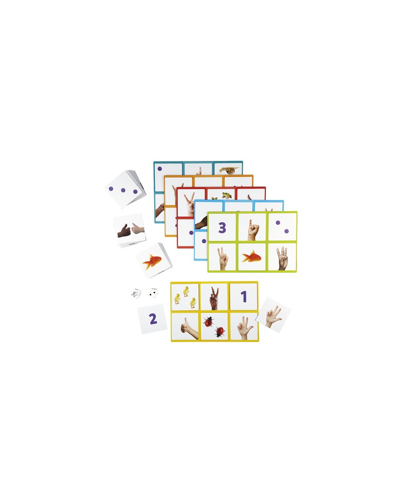 Tre semplici giochi di numerazione per scoprire i numeri fino al 3 con i più piccoli: 1 gioco del lotto, 1 memory e 1 gioco con i dadi. A turno, ogni giocatore lancia il dado (punti o dita) poi pesca una carta corrispondente alla quantità letta sul dado. Cerca sulla sua plancia una casella della stessa quantità, qualunque sia la rappresentazione, e la posiziona. Contenuto: 6 tavole 33 x 23 cm,36 carte 10 x 10 cm, 2 dadi 3,2 cm e 1 guida didattica. Per 6 bambini.