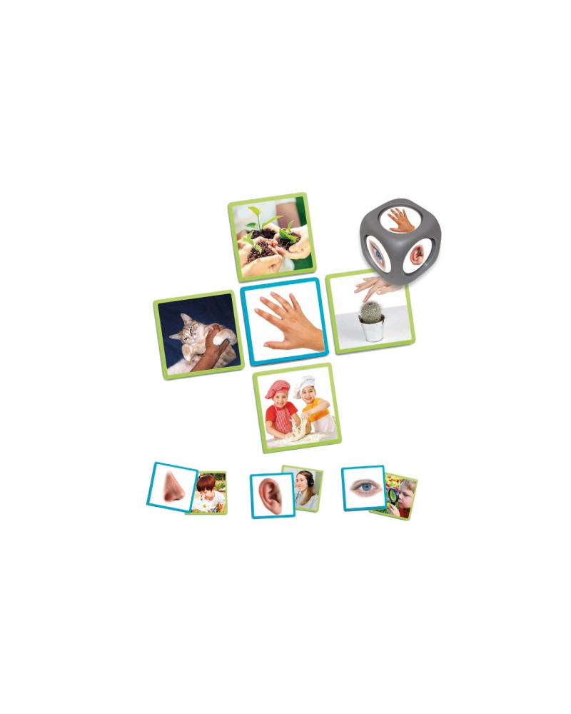 Le schede mostrano la foto di un organo sensoriale - l’occhio, il naso, l’orecchio, la bocca e le mani e altri 40 oggetti e situazioni diverse in cui questi sensi sono usati. Il bambino combina la sensazione con la situazione, mentre parla, interpretando, spiegando ciò che vede nella fotografia e quale esperienza sensoriale potrebbe causare. Cartelle in cartone 9 x 9 cm. Da 3-6 anni