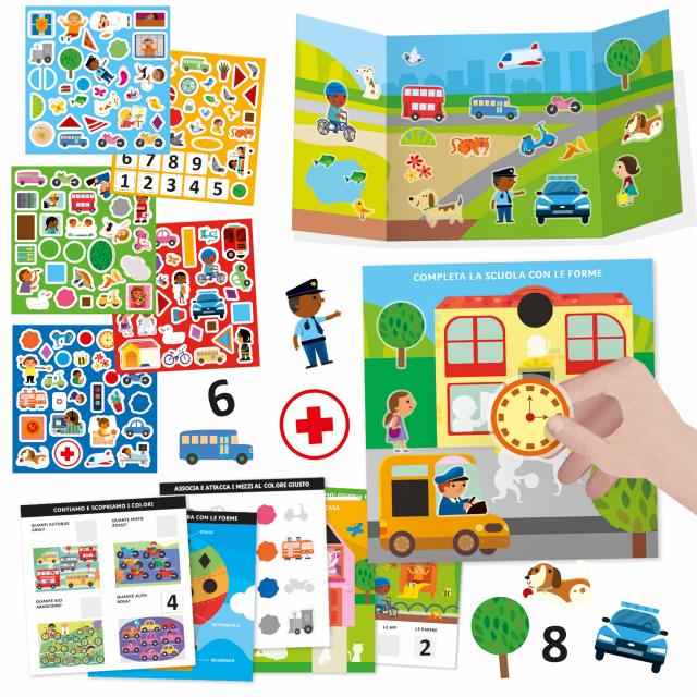 Una linea di adesivi-gioco che stimola le intelligenze naturali dei bambini grazie al programma didattico a schede progressive e agli speciali stickers resistenti e riusabili. Di che colore è l’autobus? E che forma ha la ruota? Scopri i numeri, le forme e i colori della città e divertiti ad attaccare e staccare gli stickers tutte le volte che vuoi! Con le schede attività imparare è un gioco divertente!