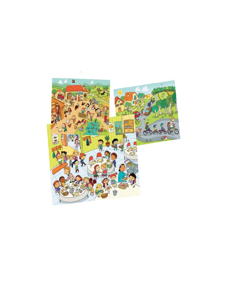Ogni illustrazione propone una situazione in cui vengono rappresentati più di 20 comportamenti e azioni differenti. Osservando i personaggi e le loro azioni, il bambino riesce progressivamente a sviluppare il suo senso critico e a riflettere su come “vivere insieme”. A scuola: nel cortile della scuola - in classe - alla mensa scolastica - in palestra - in piscina. In famiglia: nella camera dei bambini - compleanno - passeggiata con la famiglia in bicicletta. In società: viaggio in pullman - allo zoo - nella fattoria -visita della fortezza. Contenuto: 13 poster 52 x 40 cm. e 1 guida didattica su CD. Da 4+ anni.