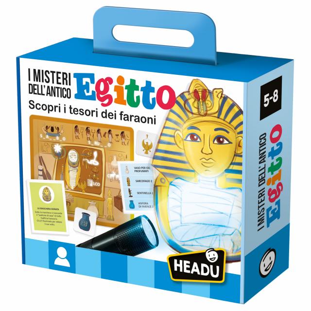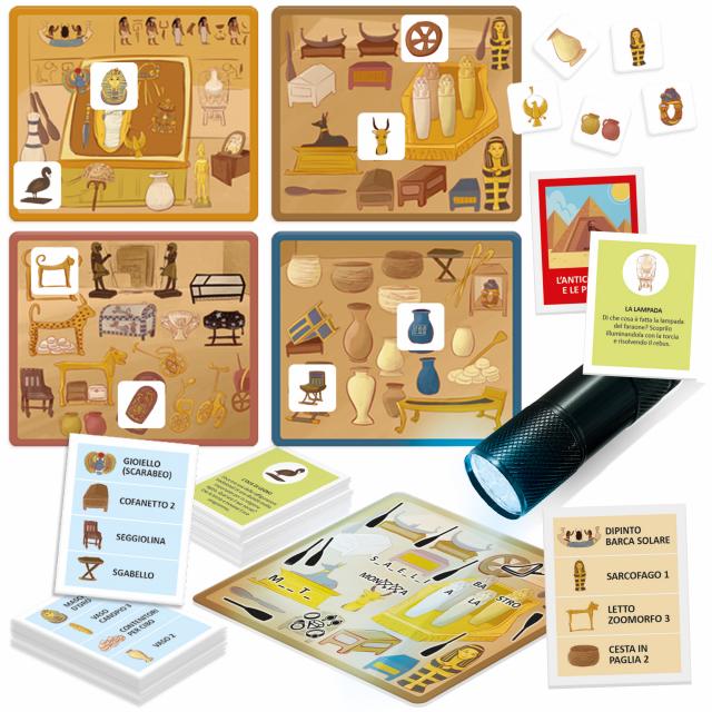 Un fantastico viaggio alla scoperta dei tesori dei faraoni. Cerca e classifica i reperti della tomba di Tutankhamon, risolvi gli enigmi e ricostruisci la storia degli antichi Egizi. CONTENUTO: 4 plance tomba del faraone; 80 tessere reperto; 20 carte cerca-reperto; 30 carte enigma; 10 carte linea del tempo; Torcia UV; Regolamento scaricabile tramite QRcode.