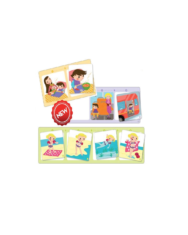 La serie di immagini incoraggia i bambini a passare dalla descrizione alla narrazione e a mettere in parole le relazioni temporali (prima, dopo,nel mezzo), le relazioni spaziali e le relazioni causali (perché?, perché sì). Le sequenze sono progressive di 2, 3 e poi 4 immagini. La scatola contiene: 24 tavole di attività 23/33/46 x 13 cm; 52 schede immagine 10 cm; 1 guida pedagogica. Da 3+ anni.