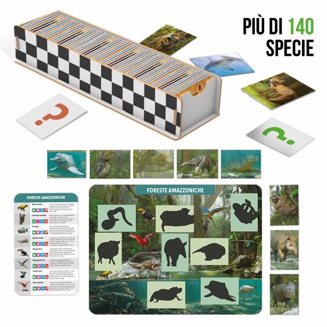 Sfida gli amici e parti alla scoperta degli animali e dei loro ambienti! Con questa tombola puoi scoprire e classificare più di 140 specie note e meno note, tutte abilmente illustrate. Per vincere occorrono bravura, memoria e un po' di fortuna! CONTENUTO: 9 cartelle-ambiente; 1 plancia di gioco; 72 tessere degli animali; 12 tessere quiz; 9 schede sugli animali; 1 cartella regolamento.