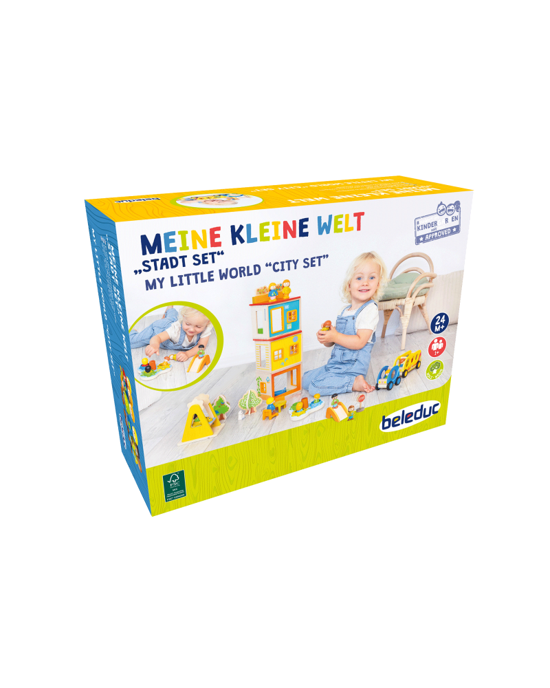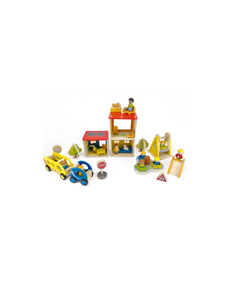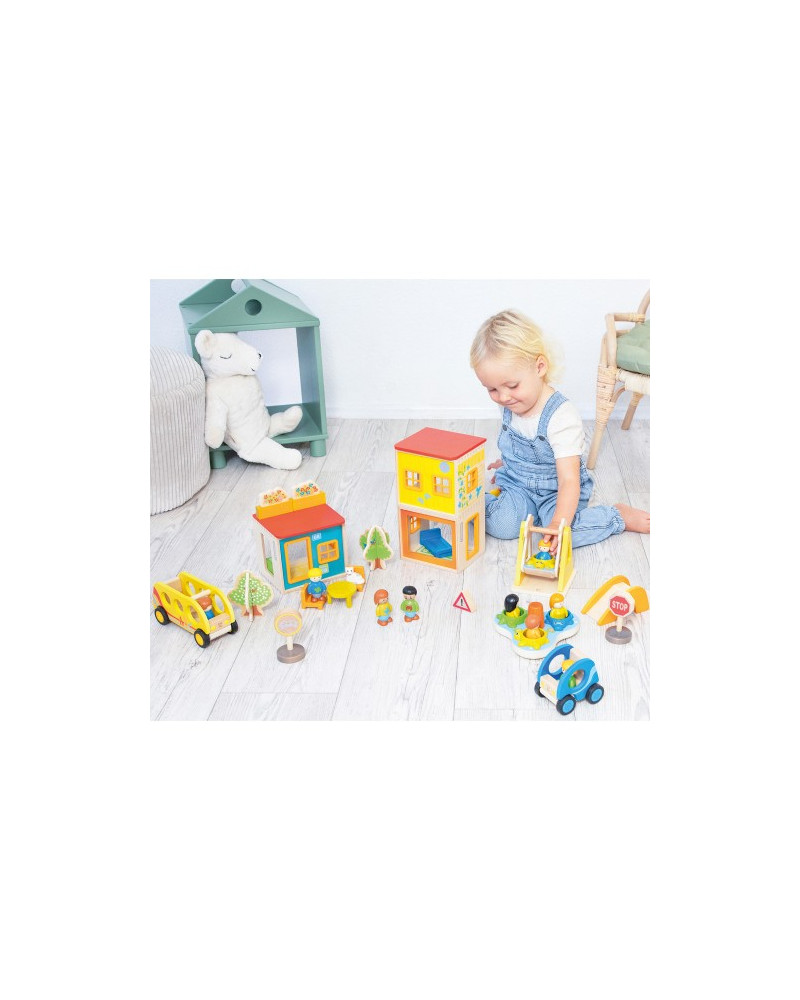 Set composto da 32 pezzi in legno di faggio proveniente da foreste certificate FSC e bioplastica. La casa può essere arredata e sistemata in modo variabile dove la famiglia può trasferirsi. I bambini si divertiranno al parco giochi, faranno un giro in autobus o trascorreranno del tempo con i genitori a casa! Dimensioni: 13 x 15 x 12 cm. Da 2+ anni.