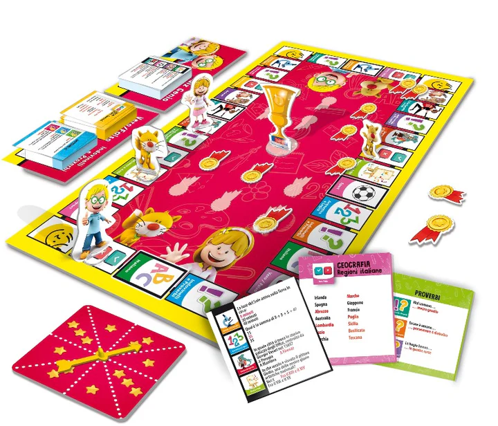 Un grande gioco di percorso con ben 5000 quiz multidisciplinari, basati sui programmi della scuola primaria. Le domande, facili e stimolanti, sono suddivise in quiz “genius”, quiz vero o falso, indovinelli e simpatici proverbi. Per vincere bisogna conquistare le coccardine, avanzando sul tabellone, e guadagnare per primi la grande coppa Piccolo Genio! Per tutta la famiglia!