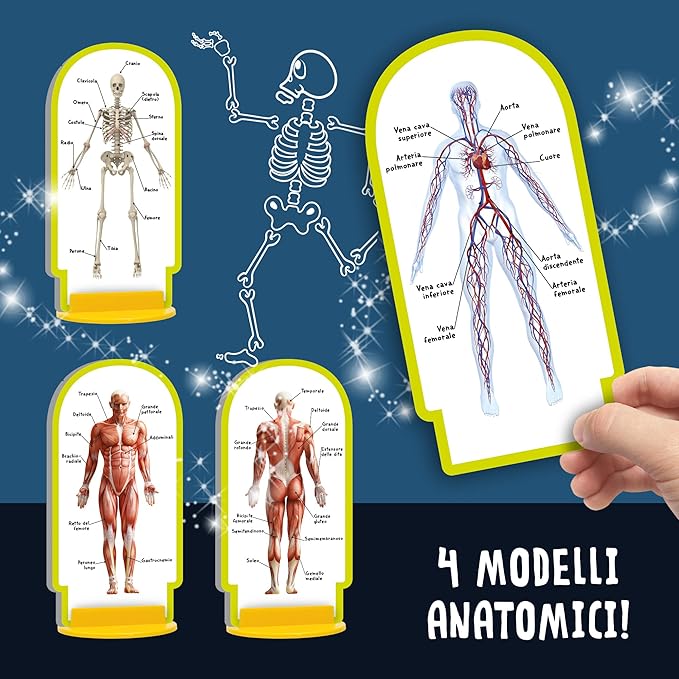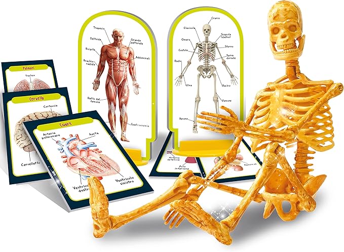 - Gioco di sperimentazione scientifica, scheletro umano da costruire, special cards, card-stand, 2 modelli sagomati, manuale illustrato