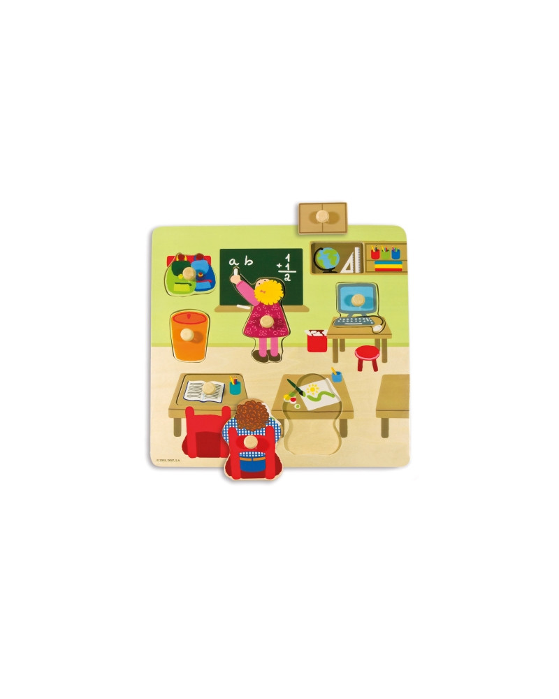 Vassoio in legno con 7 incastri con pomelli ispirati al tema della scuola. Dimensioni: 29 x 29 x 2,5 cm.