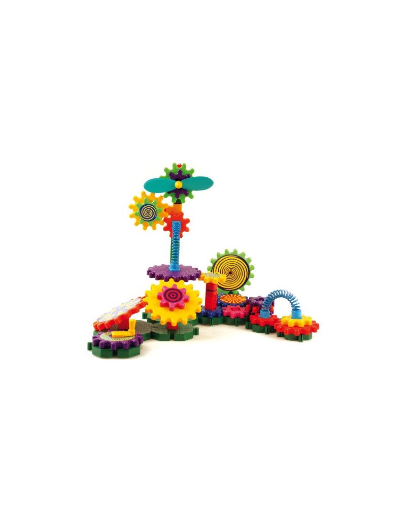 Confezione con raccordi a molla che permettono la trasmissione del movimento tra ingranaggi distanti tra loro ed elementi decorati per arricchire le costruzioni di divertenti effetti ottici. In plastica; 82 pezzi (basi, eliche, e manovelle).