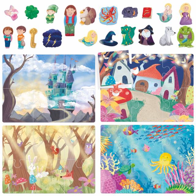 Ricostruisci gli scenari e gioca ad inventare tante storie. Hai a disposizione un manuale con suggerimenti utili e divertenti personaggi sagomati. CONTENUTO: 4 scenari a puzzle da sei pezzi ciascuno; 20 soggetti sagomati; Istruzioni con tanti suggerimenti.