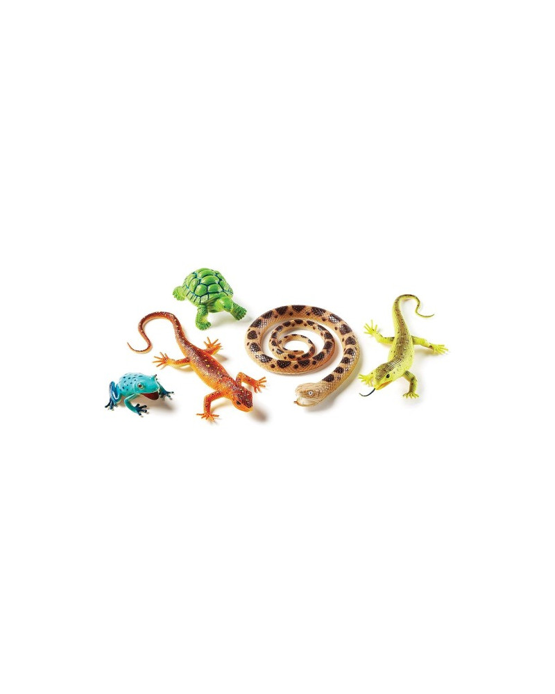 Confezione da 5 rettili/anfibi: rana arboricola, serpente, tartaruga, geco e iguana. Dimensione serpente 91,5 cm. Da 3+ anni.
