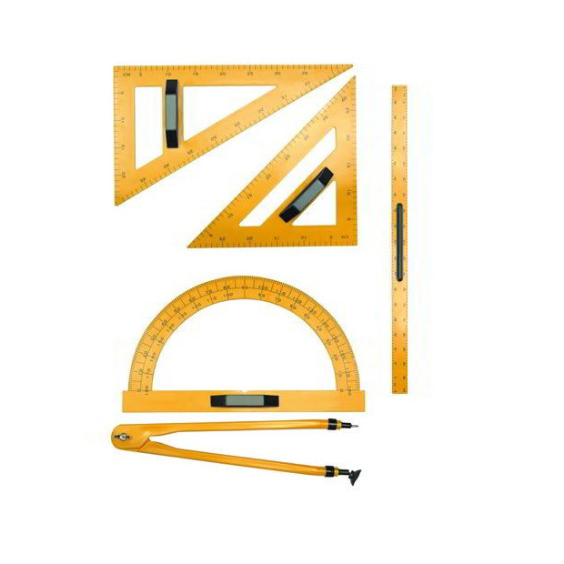 Art. 09253 Il Set contiene:2 squadre 60 cm., 1riga 100 cm., 1 compasso 50 cm., 1 goniometro 50 cm., 1 pannello per fissaggio a muro. Il pannello rigido si fissa alla parete con delle semplici viti, mentre tutti gli altri strumenti in robustissimo materiale acrilico sono sorretti da pratiche spinette.