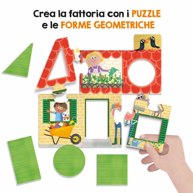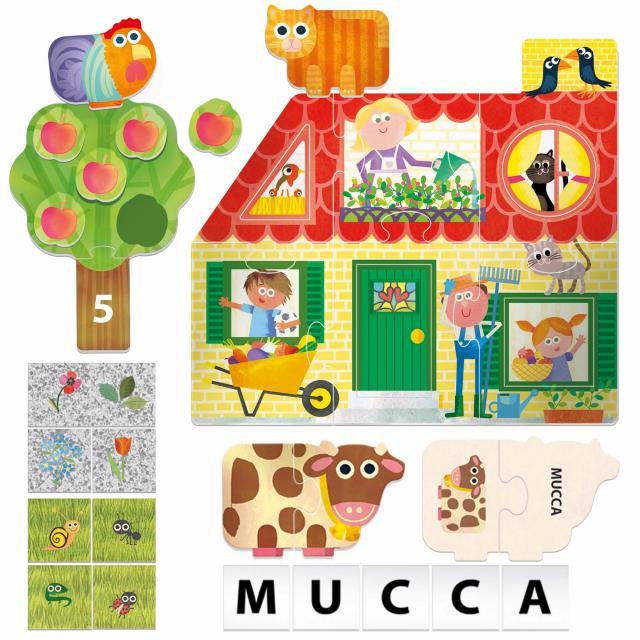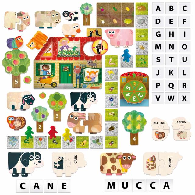 Giochiamo con la casa delle forme? Componiamo i nomi degli animali? Quanti frutti ci sono sull’albero? Questa raccolta di giochi didattici stimola le intelligenze dei bambini in modo spontaneo e divertente. CONTENUTO: 1 puzzle della fattoria con 4 forme geometriche ad incastro; 12 puzzle degli animali e delle parole; 5 alberi dei numeri e delle quantità con 15 frutti sagomati; 36 tessere double face lettere-percorso; 1 mulino-spinner; 4 pedoni; guida didattica.