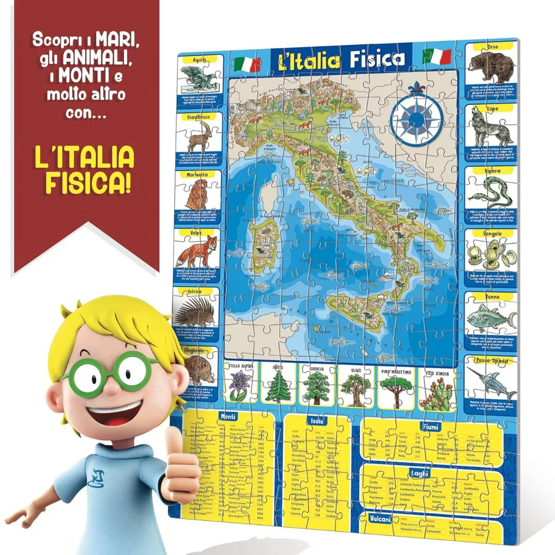 Il puzzle 2in1 La mia bella Italia è un gioco educativo realizzato da Lisciani allo scopo di imparare la geografia, usi e costumi, flora e fauna dell´Italia in modo divertente. Il puzzle da 108 pezzi raffigura l´Italia politica con evidenziate regioni, capoluoghi, monumenti, città principali e ai lati schede con le caratteristiche riassunte regione per regione. Stufi dell´Italia politica?! Girate i pezzi del puzzle e assemblate l´Italia fisica per scoprire montagne, pianure, flora e fauna, vulcani, laghi e isole della penisola. La confezione comprende un puzzle da 108 pezzi double-face 50x70 raffigurante Italia politica e fisica. Il puzzle 2in1 La mia bella Italia è un prodotto made in Italy. Da 5 a 10 anni.