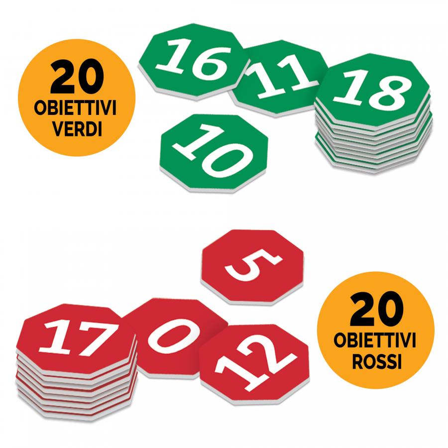 Contenuto: 25 cartine-numero (+ 1 di riserva); 20 tessere-obiettivo verdi; 20 tessere-obiettivo rosse; 1 paletta-alt; Regolamento con esempi.