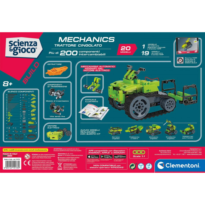 - Tra i componenti inclusi nel kit ci sono: ruote dentate, cingoli, modulo di trasmissione, pannelli e un motore elettrico per costruire, smontare e ricostruire tutti i modelli possibili