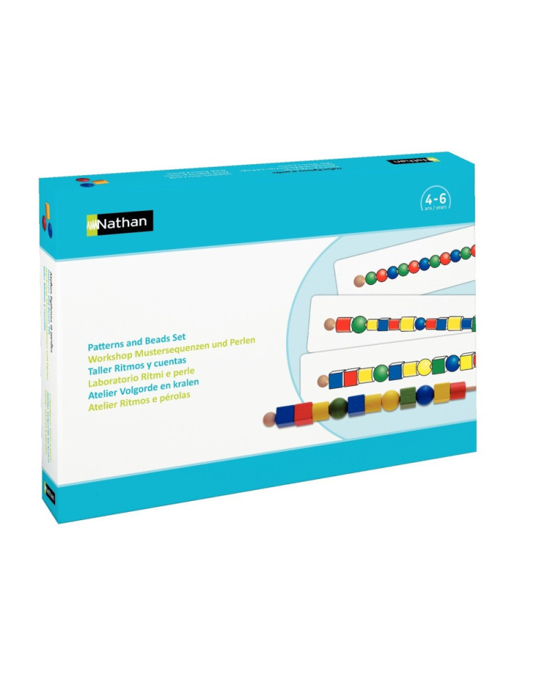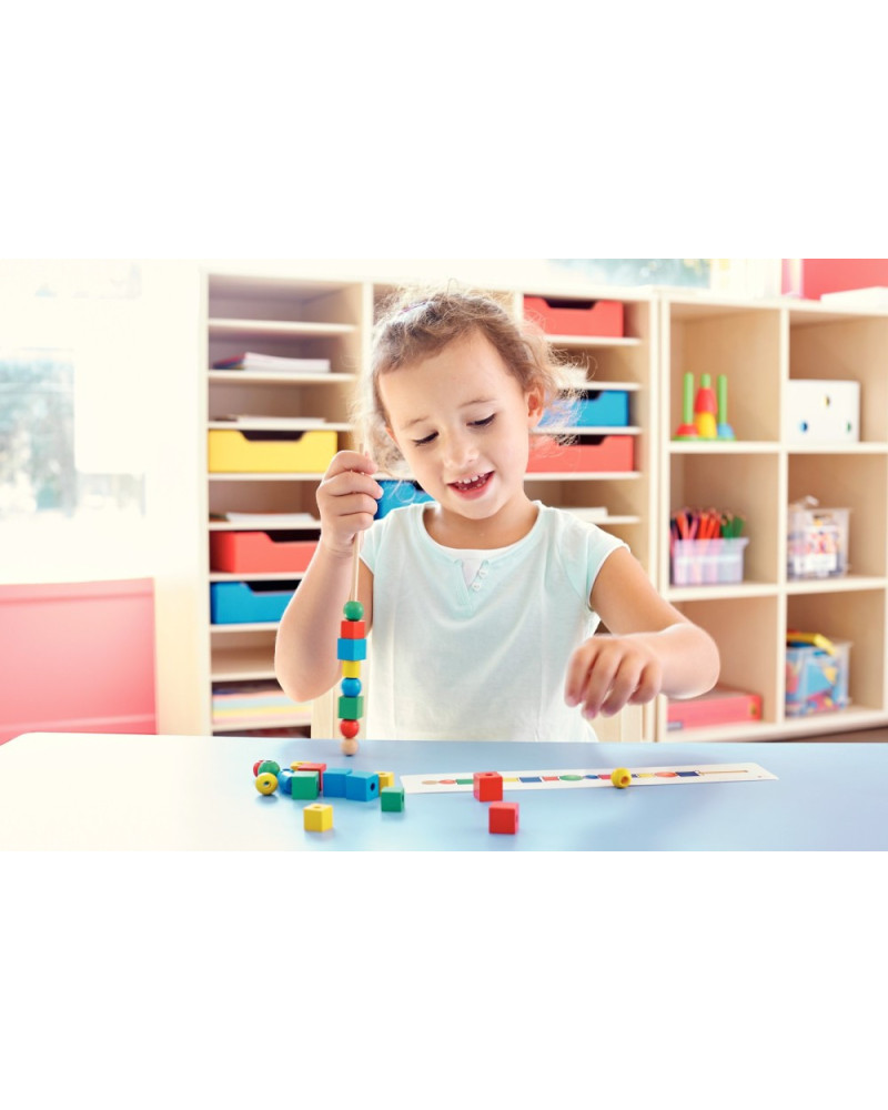 Le schede possono essere utilizzate in piano o in verticale permettendo due sensi di lettura e di analisi della sequenza. Il materiale del laboratorio consente di far lavorare 2 bambini. Contenuto: 24 schede attività 78 perle in legno in 3 forme (cubo, cilindro, sfera). Diametro di sfere e cilindri: 17/14 mm, lato dei cubi: 17/14 mm, 4 colori, 2 dimensioni , 4 bastoncini in legno 18/25 cm, 1 guida per l’insegnante.