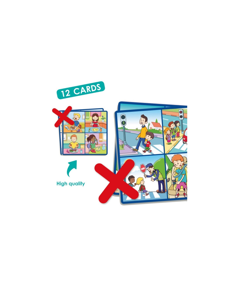 Il gioco consiste nell'osservare le 4 immagini su ogni scheda di gioco e indicare con la croce l’atteggiamento inappropriato. Ideale per sensibilizzare i bambini più piccoli ai valori di affetto, salute e sicurezza. Contenuto 12 carte plastificate 15 x 15 cm e 12 crocette rosse in plastica. Possono giocare fino a 12 bambini. Da 3+ anni.