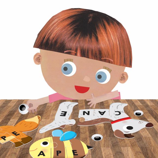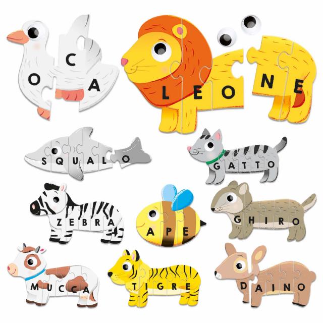 Divertiti a comporre i puzzle autocorrettivi degli animali e impara a leggere e scrivere le prime parole. In più, puoi rendere animate le sagome con gli occhietti adesivi.