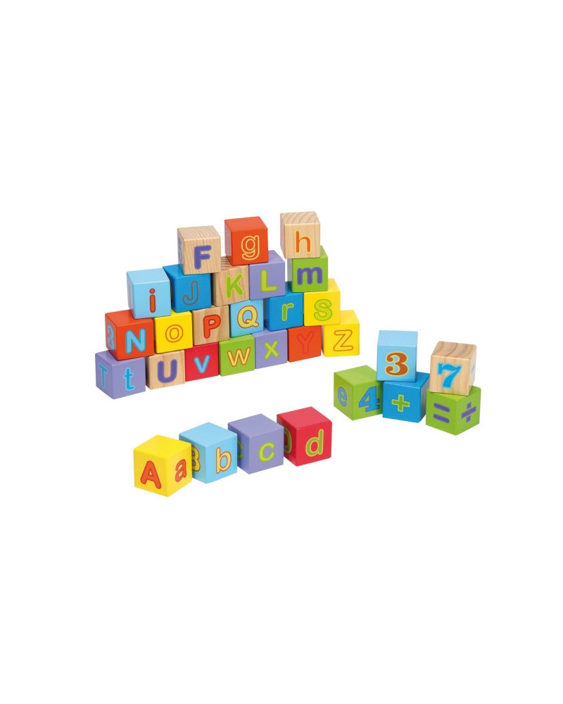 Un set di 30 cubi in legno, resistenti e sicuri, con lettere minuscole e maiuscole, numeri e simboli matematici (+, –, ÷, =) colorati su ogni faccia. Ideali per stimolare il riconoscimento delle lettere e dei numeri, le prime composizioni di parole e le semplici operazioni matematiche. Dimensionii: 4 x 4 x 4 cm. Da 1+ anni.