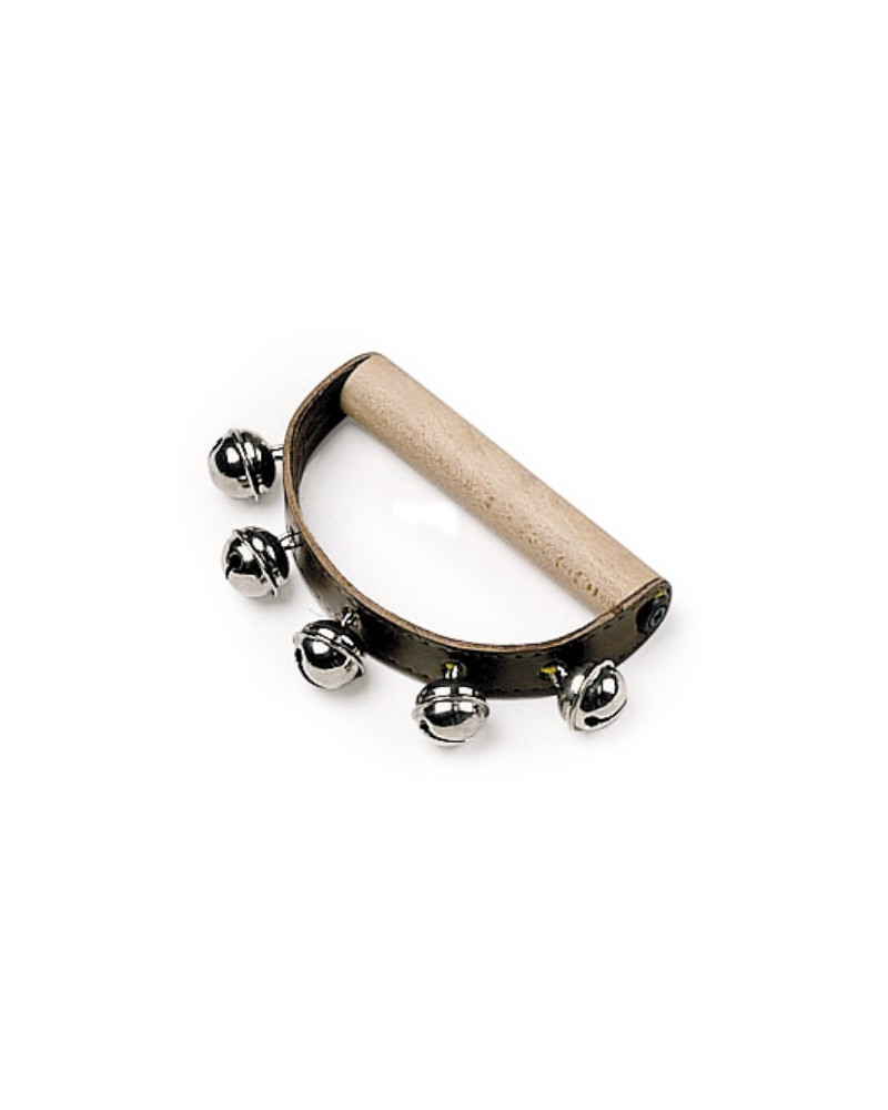 Impugnatura in legno e 5 campanelli su supporto in pelle. Dimensioni: 11, 5 x 2,5 x 7 cm.
