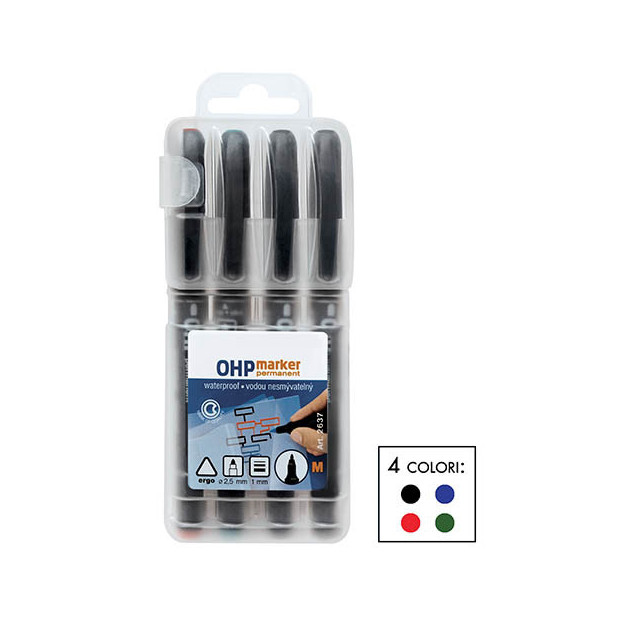 Marker OHP 4 colori assortiti(nero/blu/rosso/verde)con punta sintetica indeformabile, studiati per scrivere su fogli trasparenti per proiezione, diapositive, cd, pellicole, lucidi, ecc... Inchiostro permanente resistente all'acqua cancellabile con alcool su superfici non porose. SCRIVE SU FILM, VETRO, PLASTICA, METALLO, LEGNO.