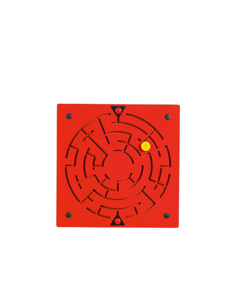 Pannello in medium density; misura cm 40 x 40 x 1,8. Con molta abilità e buone capacità di osservazione, il bambino deve trasportare il pomello giallo dal punto di partenza a quello di arrivo.