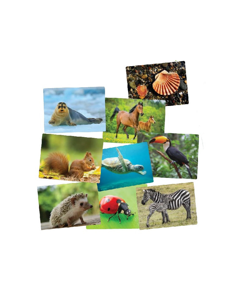 Raccolta di 70 fotografie a colori di animali ritratti nel loro ambiente naturale, suddivise in: mammiferi, uccelli, anfibi e rettili, pesci e molluschi, insetti e ragni. Le immagini consentono di eseguire il collegamento tra linguaggio descrittivo e l’osservazione scientifica. Con guida didattica. Dimensioni fotografie cm 21 x 15. Da 2+ anni.