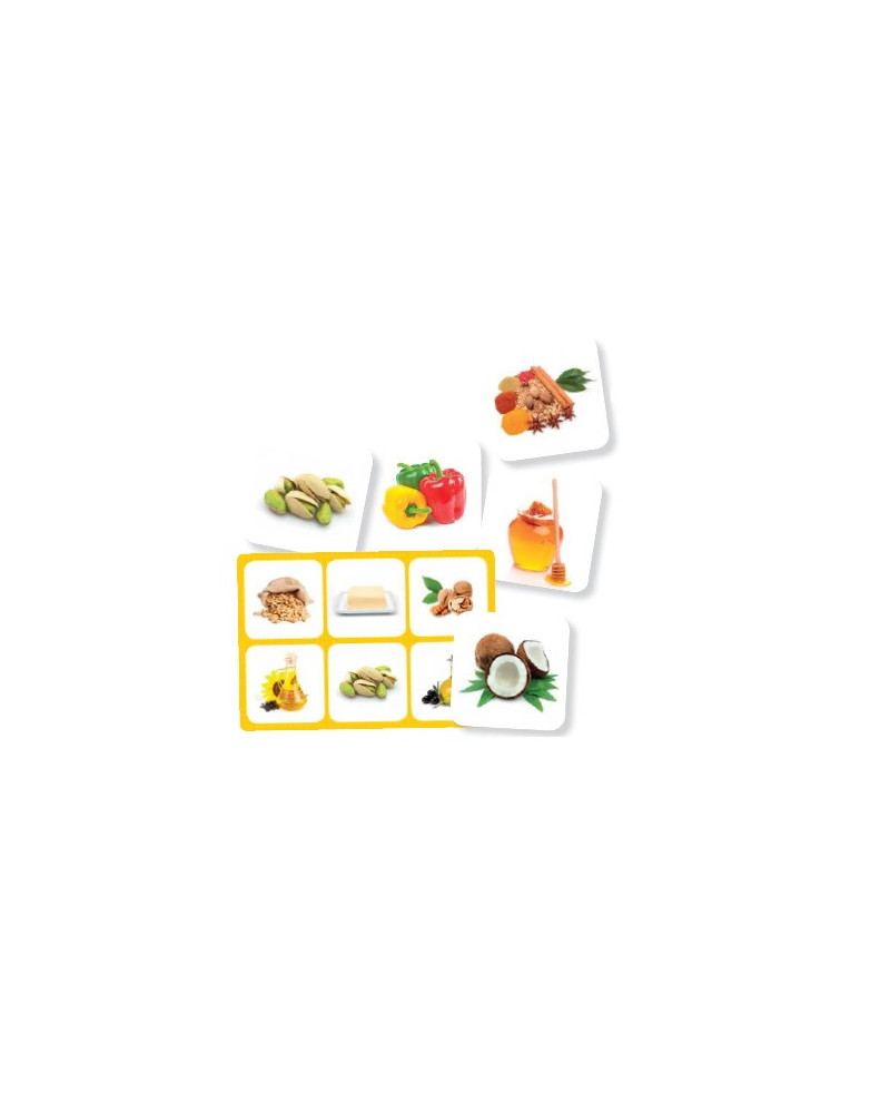 Un primo gioco del lotto per appropriarsi del lessico degli alimenti. La confezione comprende 36 foto di alimenti e 6 tabelloni di gioco. Ogni scheda rappresenta una famiglia di alimenti: frutta e verdura, cereali e prodotti derivati??, latticini, carne, pesce e uova, Grassi, Spezie e aromi. Supporto alla disabilità: Stimola il linguaggio e arricchisce il lessico. Foto su sfondo bianco con token di grande formato per facilitare il riconoscimento visivo e sviluppare il senso di osservazione. Da 2+ anni.
