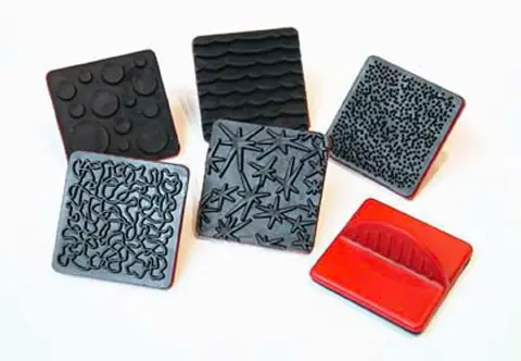 Busta 6 timbri a tampone con impugnatura, misura 6×6 cm.