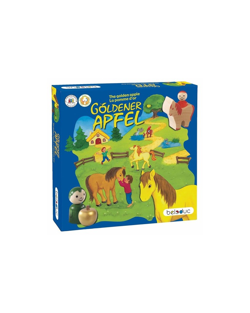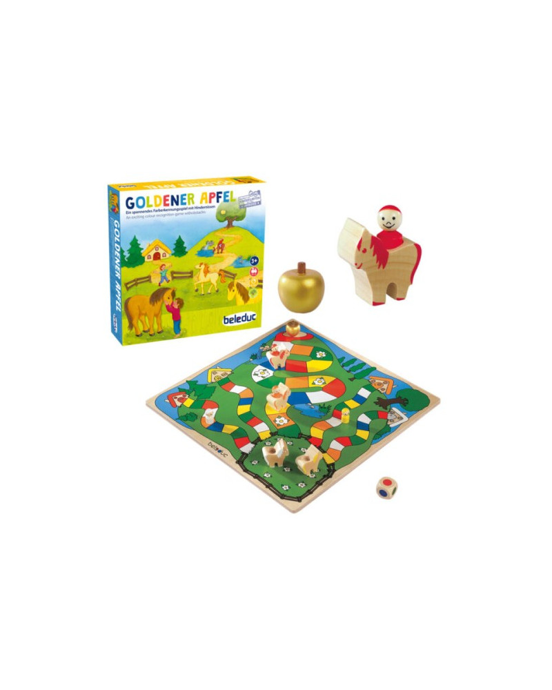 Plancia in legno; 4 cavalieri, 4 cavalli, dado colori, 1 mela d’oro; lato tabellone cm 37.