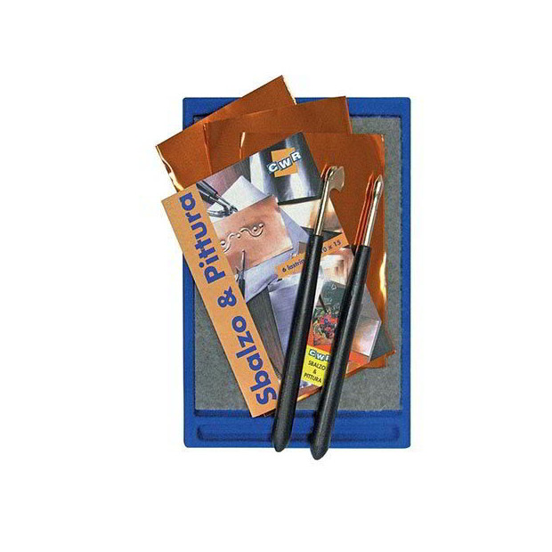 Set per sbalzo. Contiene: 1 piano di lavoro con feltro, 2 bulini per sbalzo, album 12 lastrine alluminio anodizzato rame cm. 10×15.