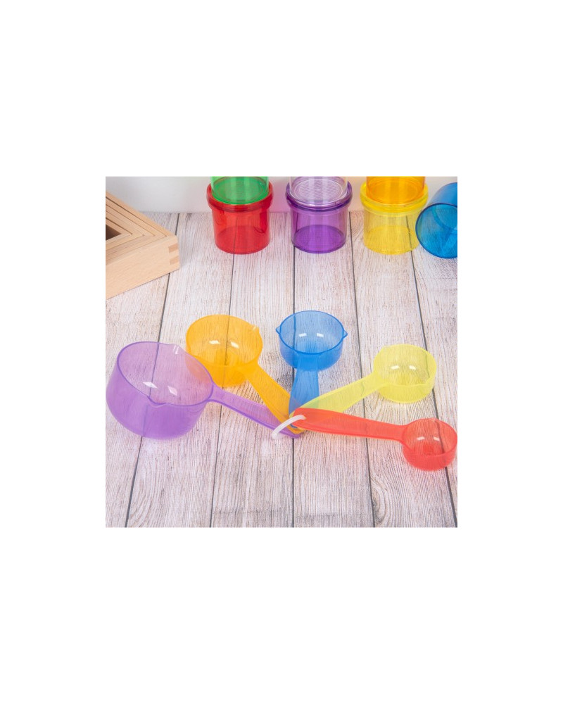 Misurini impilabili in 5 colori brillanti e traslucidi con beccucci su ciascun lato. Un'aggiunta divertente al gioco con sabbia e acqua. Diametro misurino più grande 9,6 cm.