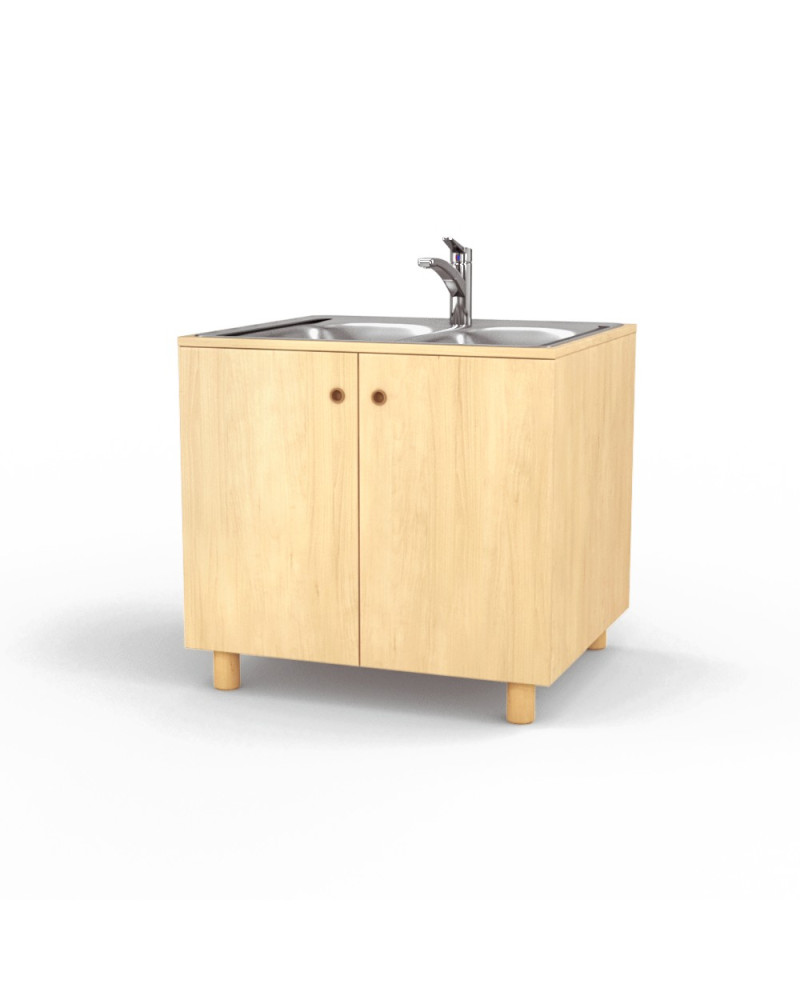 Mobile lavabo pediatrico con struttura realizzata interamente in materiale ligneo spesso 20mm rivestito in laminato su entrambi i lati con bordo in ABS in tinta e raggiato 2mm come previsto da normativa. Blocco lavabo sagomato in acciaio inox con miscelatore a doccetta estraibile. Dimensioni 85x72x80