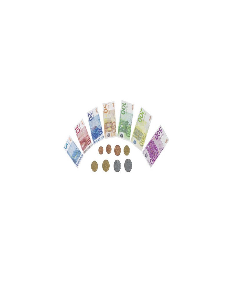 Confezione composta da 108 pezzi: 84 banconote in carta e 32 monete di plastica simili all’euro nella forma e nel colore. Dimensioni banconote 6,0 x 3,1 - 8,0 x 4,1 cm. Da 3+ anni.