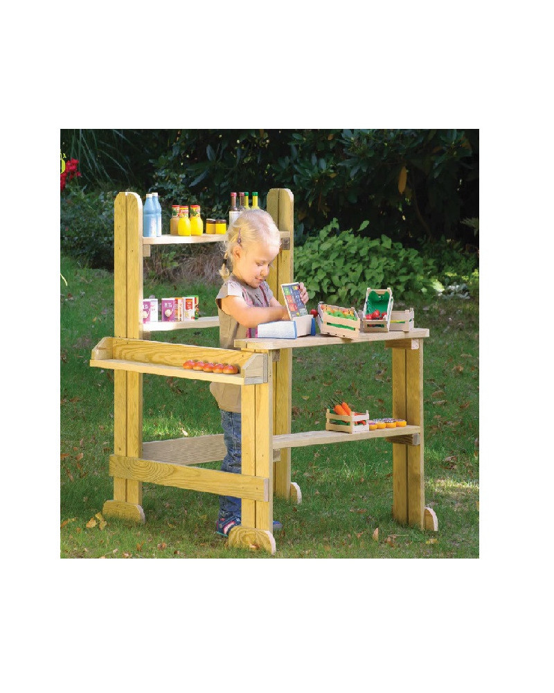 Il negozio da esterno offre ai bambini una rara opportunità di praticare questo affascinante gioco di ruolo all'aperto. E' dotato di numerose scaffalature per gli accessori. Fornito di semplici istruzioni per il montaggio. Realizzato in legno di pino nordico impregnato in autoclave per renderlo resistente alle intemperie Dimensioni 85,5 x 90,4 x 96 cm