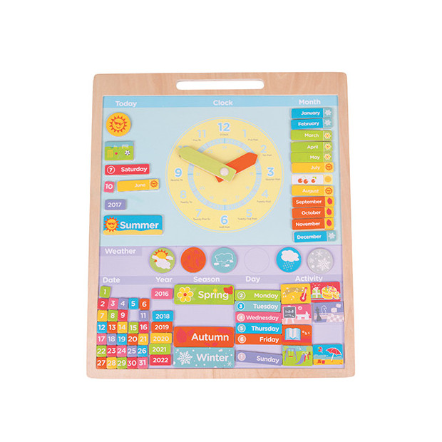 Tavola magnetica del tempo (IN LEGNO). Un ottimo modo per insegnare ai bambini i vari concetti relativi al tempo: orario, diverse stagioni, giorni/date, mesi/anni La lavagna dispone di un quadrante colorato con lancette mobili, orologi a 12 e 24 ore e magneti che indicano stagioni, giorni ecc. (in lingua inglese). Composto da 73 elementi gioco. Dimensioni 38x44,5 cm.