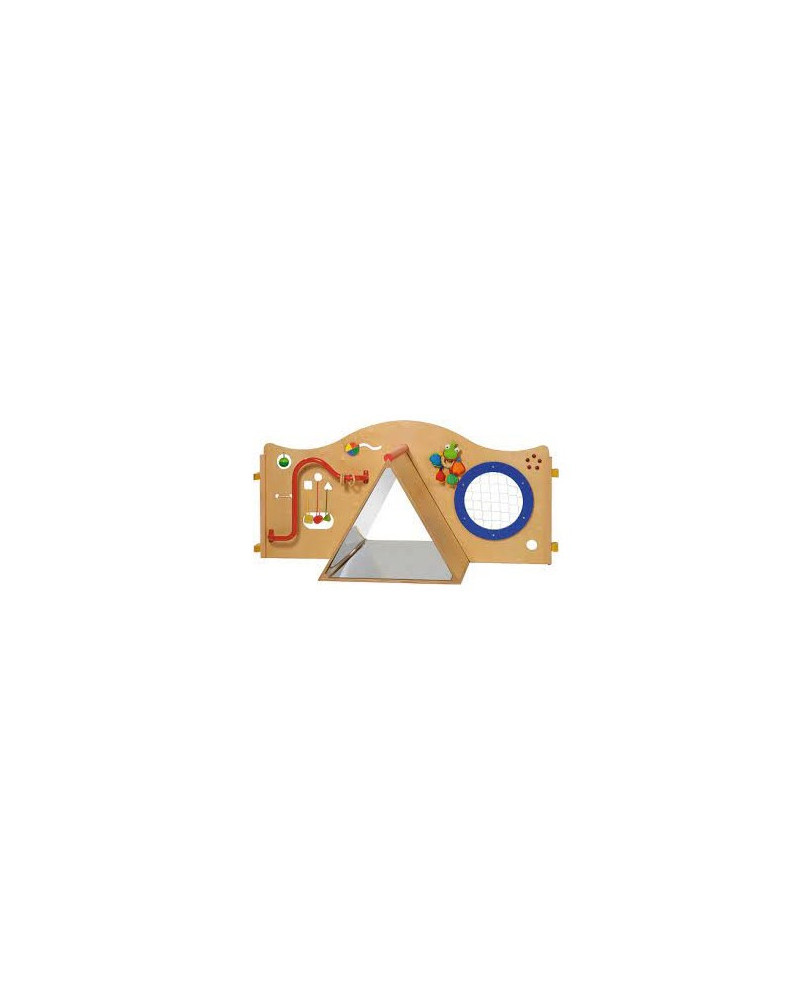 Pannello primi passi con maniglione, oblò, prisma con gli specchi e oggetti da muovere, infilare, suonare, ecc. Fornito di kit di montaggio. Dimensioni cm 132x68x100h. Età 9m+