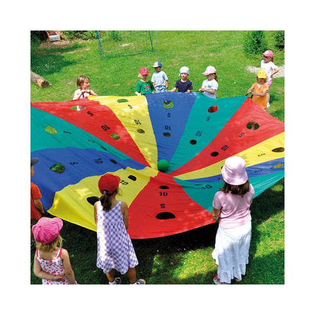 Paracadute psicomotorio in poliestere con buche/bersaglio numerate e 8 maniglioni per la presa.