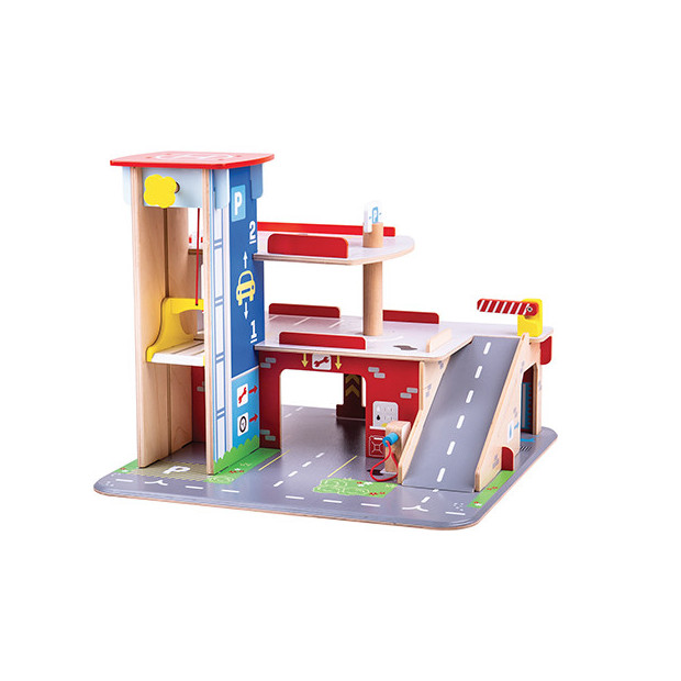 Parcheggio delle auto in legno con un kit composto da : Ascensore da lavoro, eliporto, pompa di benzina rimovibile, autolavaggio, 2 livelli di parcheggio e rampa discendente con barriera di sollevamento. Dimensioni cm. 45x37x45. Marchio di qualità garantito da:
