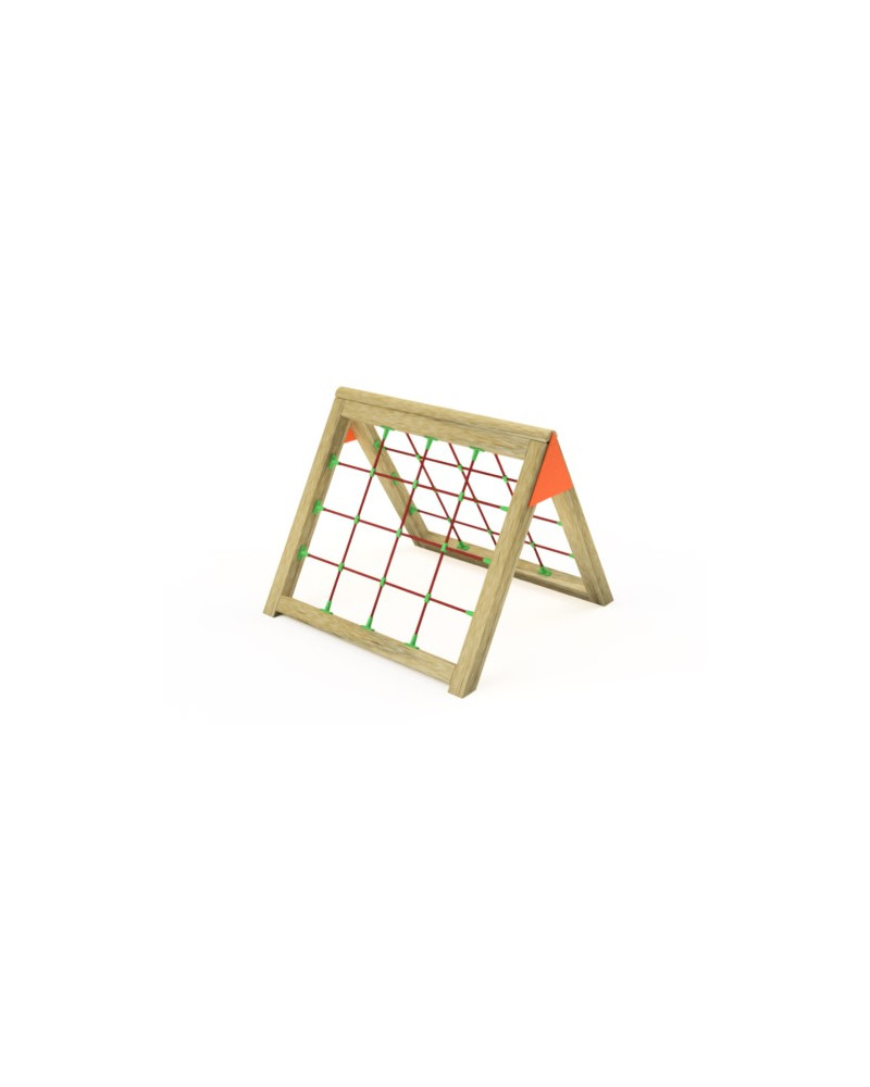 Struttura in legno di pino impregnato in autoclave, pali con spigoli arrotondati, rete con corda in nylon diametro 14 mm con anima in acciaio. Dimensione cm 140x130x115h