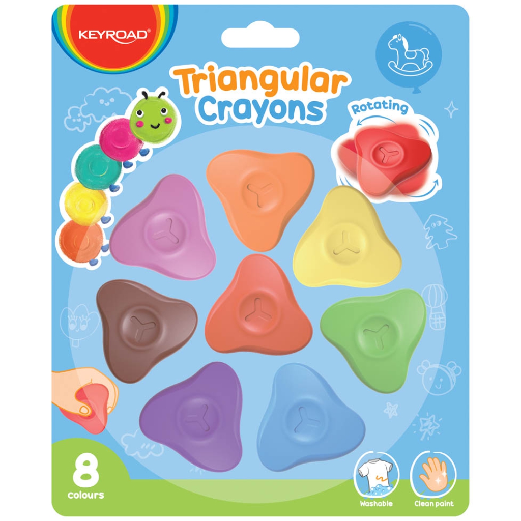 Pastelli a cera triangolari dal design ergonomico per facilitare la presa senza sporcare le mani. Scatola da 8 pastelli atossici in colori assortiti.