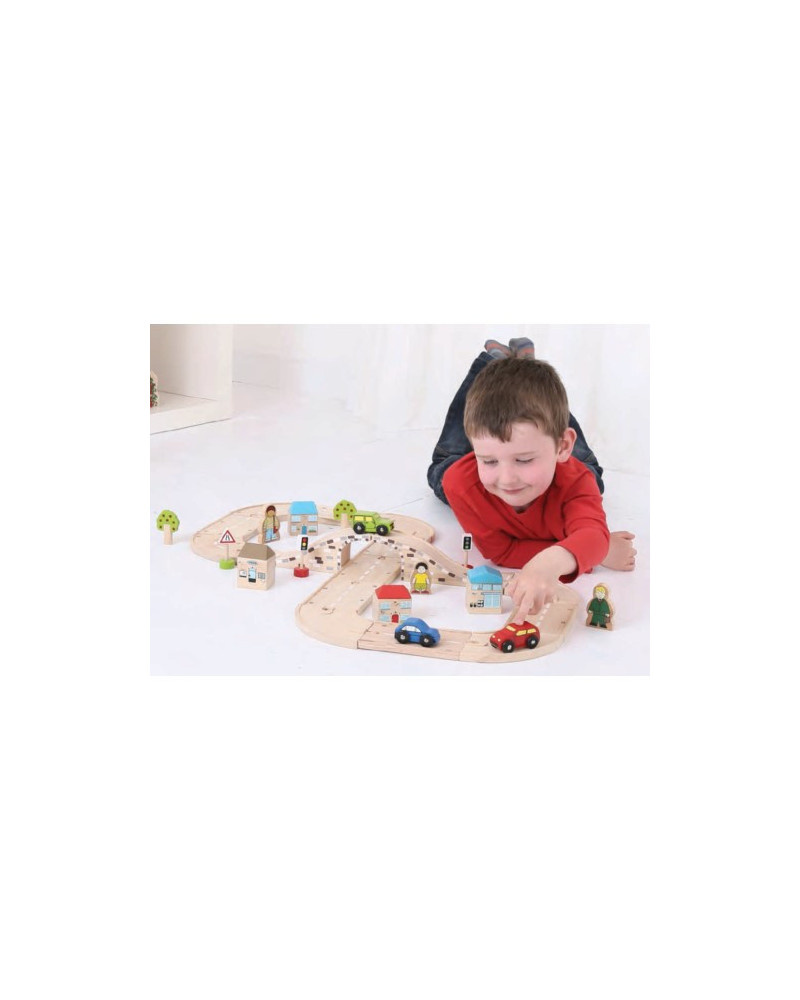 Strada in legno con percorso a forma di “8” formato da 37 pezzi, tra cui un ponte, 2 semafori, 2 alberi, quattro case, tre personaggi e tre auto. Dimensioni: 85 x 44 cm. Da 3+ anni.